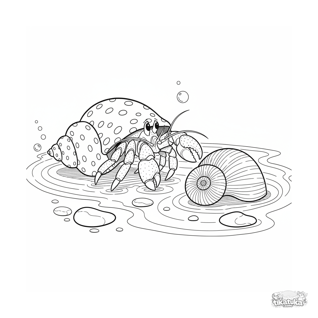 Página para colorir detalhada para 10-12 anos: um caranguejo-eremita trocando de concha em uma poça de maré ensolarada. Cena educativa com detalhes anatômicos.