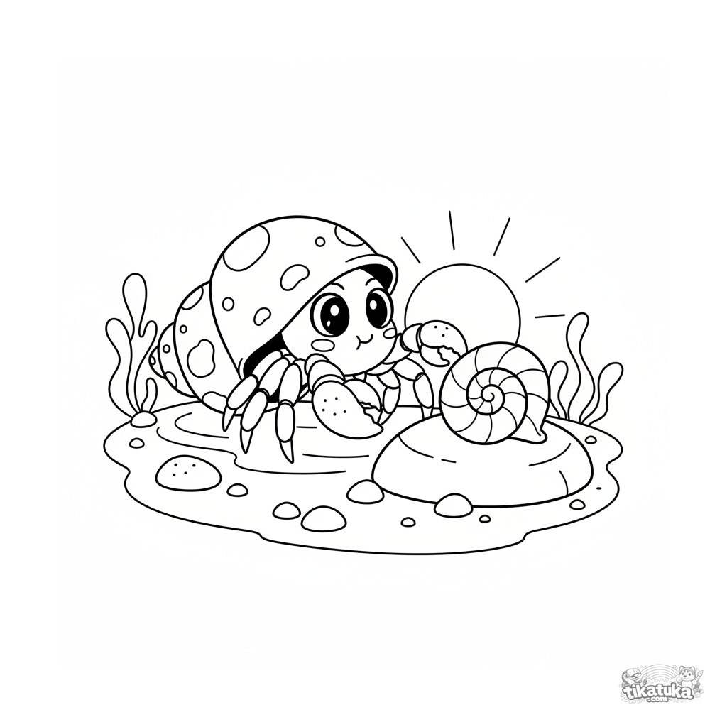 Página para colorir de um caranguejo-eremita trocando de concha em uma poça de maré ensolarada. Cena detalhada para crianças de 7 a 9 anos.