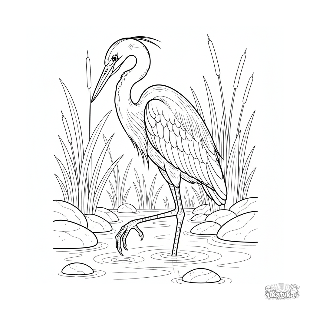 Página para colorir realista para 10-12 anos: uma garça cinza parada na água clara de um riacho, caçando peixes. Ilustração detalhada de um pássaro em seu habitat.