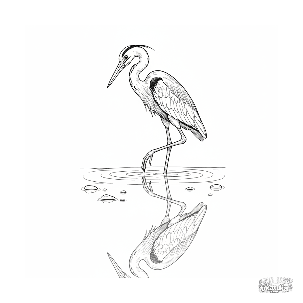 Página para colorir intrincada para crianças de 10-12 anos: uma garça em pé na água clara de um riacho. Estilo gravura vintage, com detalhes de reflexo.