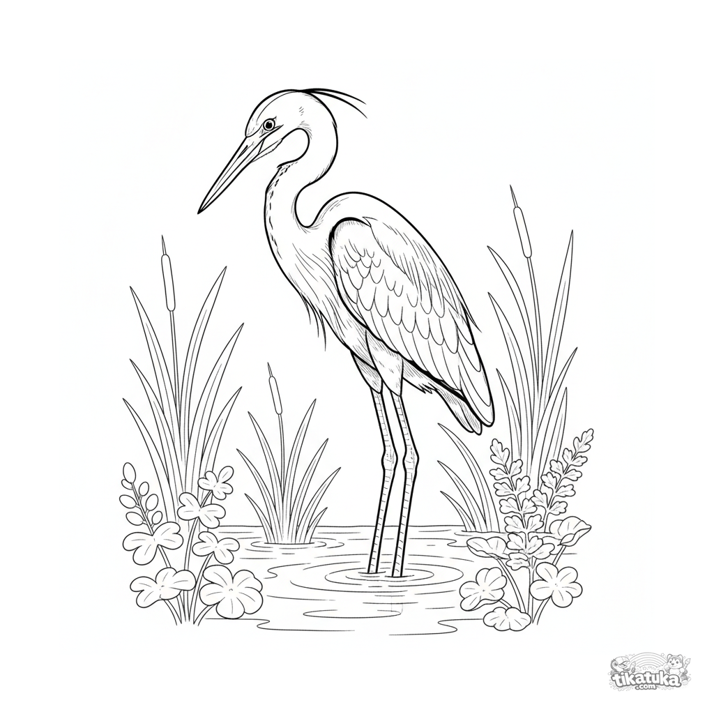 Página para colorir para pré-adolescentes 7-9: uma garça cinza alta fica imóvel sobre uma perna na água rasa de um riacho, observando peixes entre plantas aquáticas.