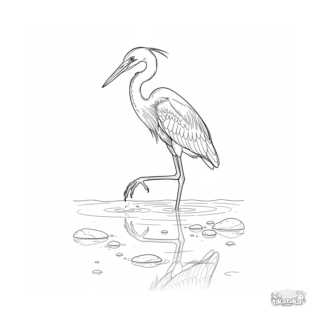 Página para colorir para crianças mais velhas 10-12: uma garça cinza parada na água rasa de um riacho claro, seu reflexo visível, observando a presa.