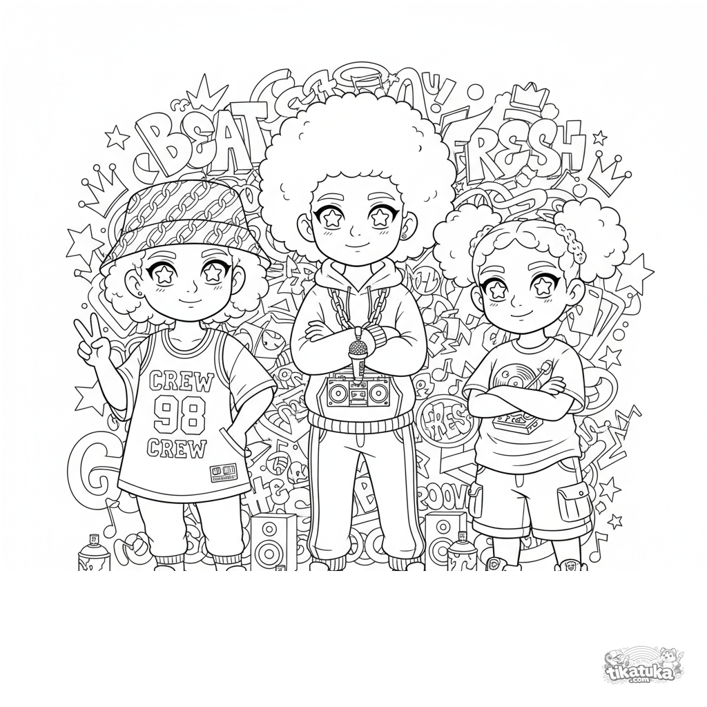 Página para colorir para crianças de 7-12 anos: uma crew de hip-hop confiante posa diante de um muro de graffiti colorido e detalhado.