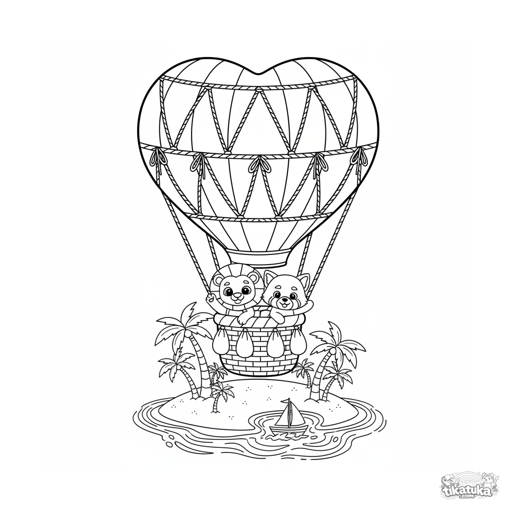 Página para colorir para crianças 4-6: um balão de ar quente em forma de coração flutua sobre uma ilha tropical idílica. Linhas suaves, atmosfera de conto de fadas.