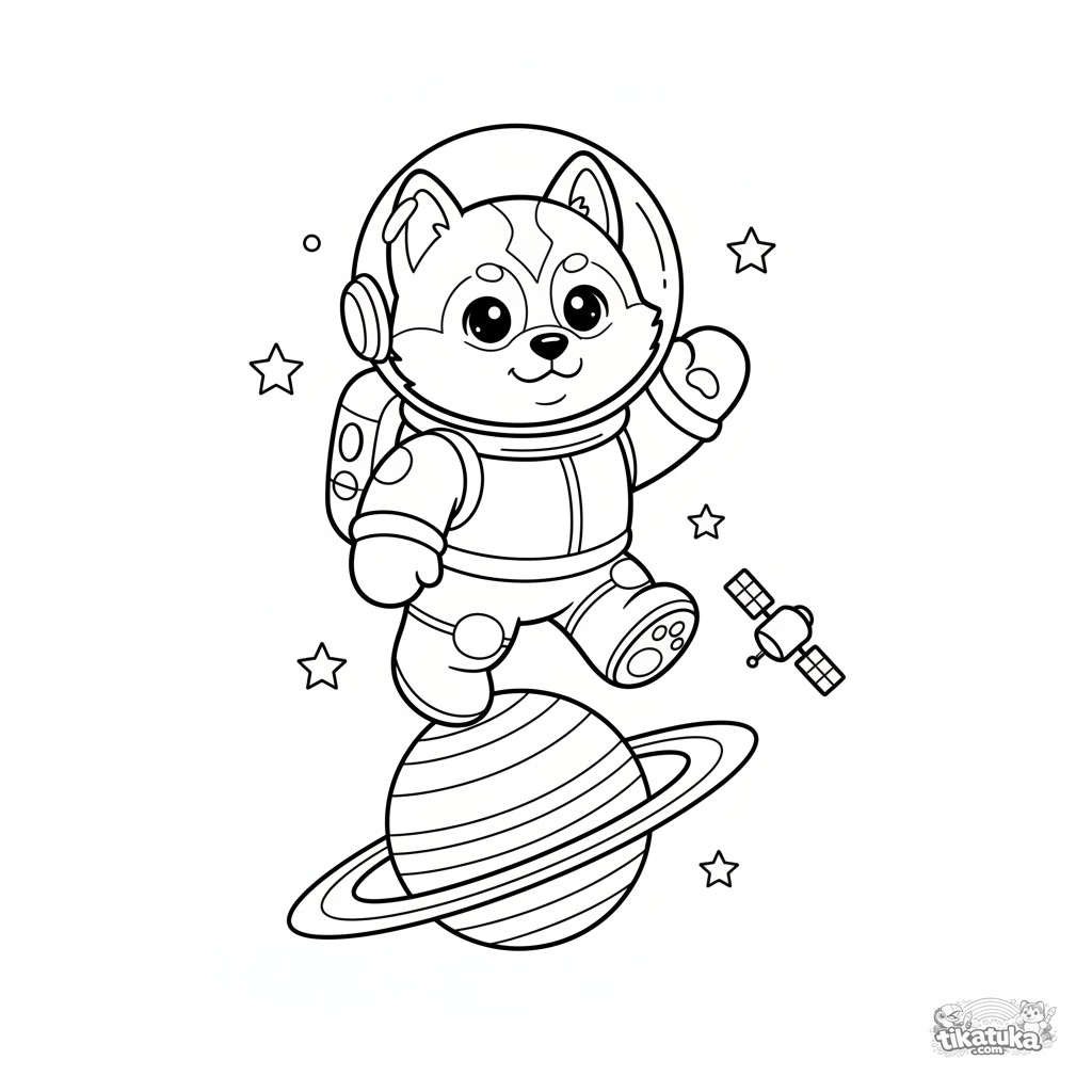 Página para colorir para crianças: um husky em traje espacial flutua perto de um planeta anelado. Linhas simples, personagem fofo, adequado para 4-8 anos.