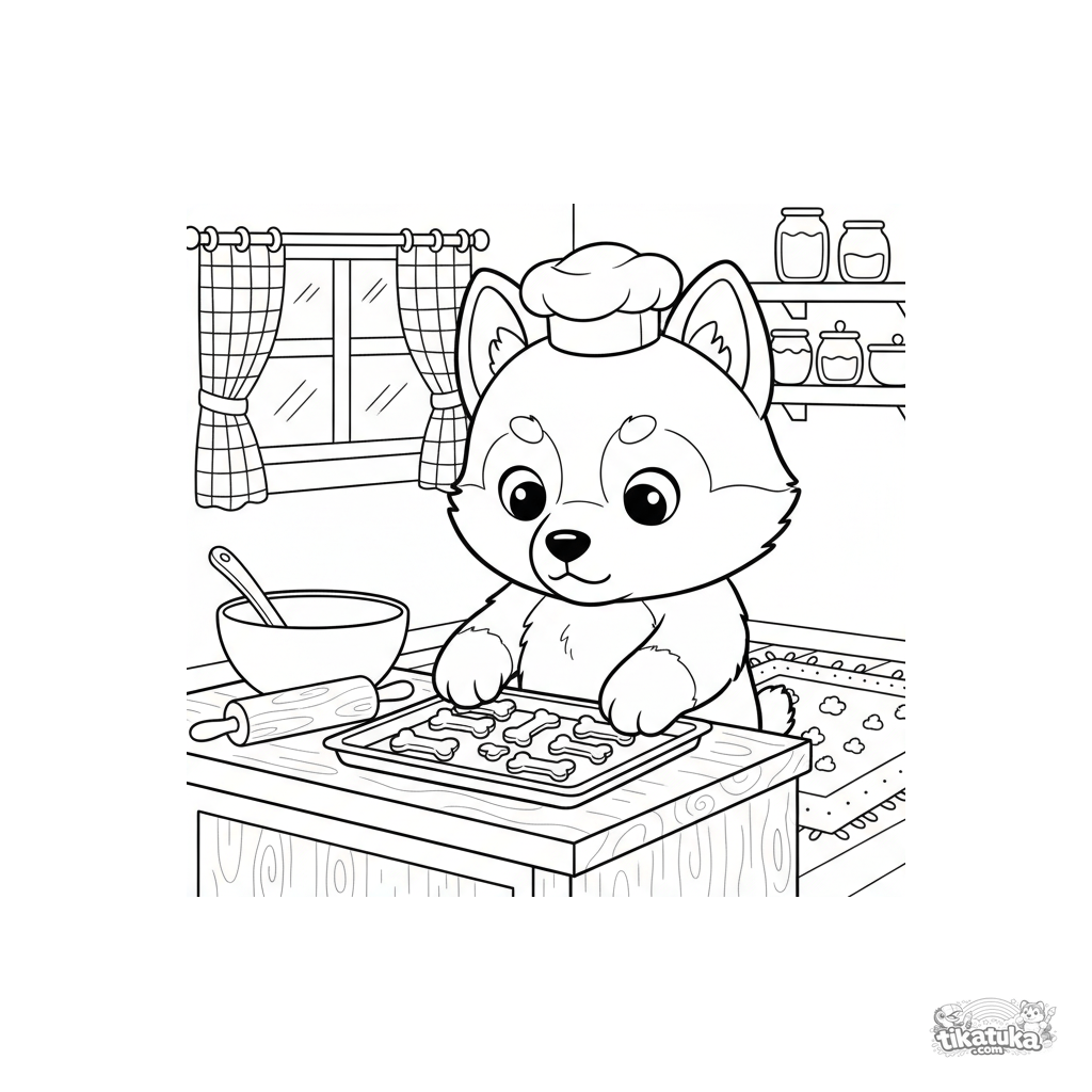 Página para colorir: Husky Lutik como padeiro preparando biscoitos na cozinha. Tema fofo, linhas simples, para 4-6 anos.