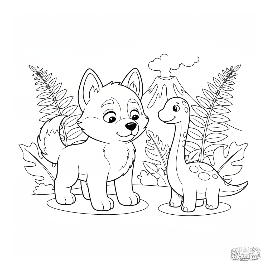 Página para colorir: Husky Lutik encontra um dinossauro pequeno em uma selva pré-histórica. Personagens amigáveis, fundo simples, para 4-6 anos.