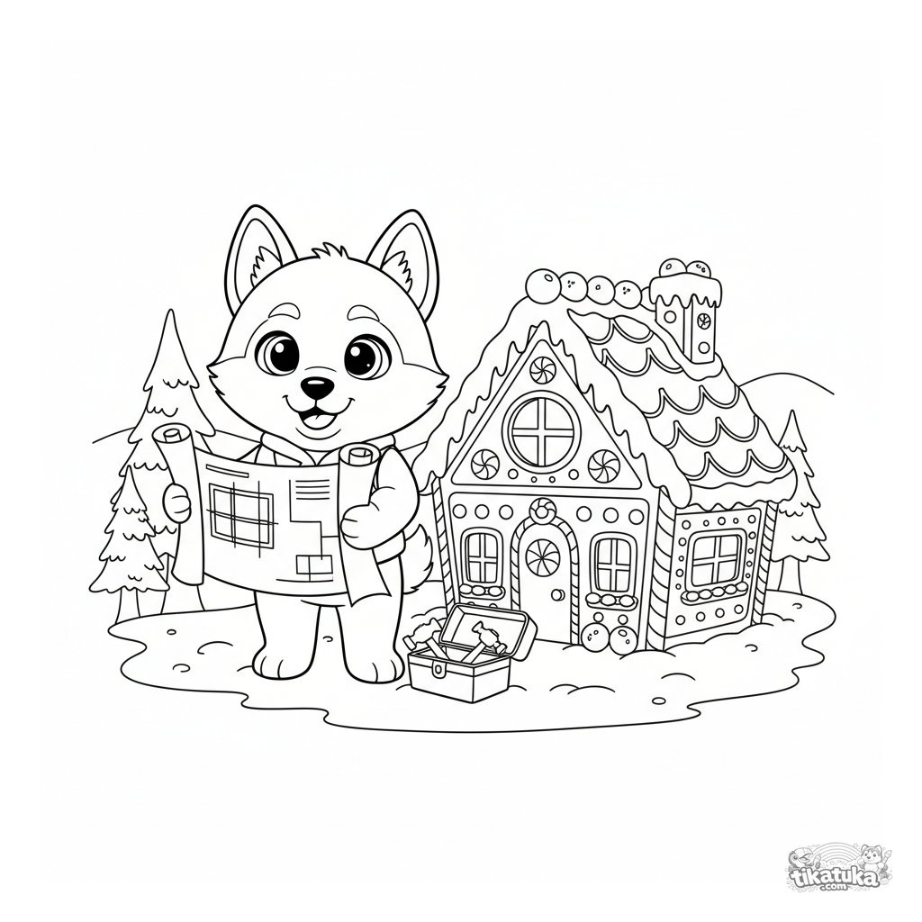 Página para colorir para crianças: um husky arquiteto com uma planta ao lado de uma casa de gengibre recém-construída. Estilo de boneco macio, cena de inverno, para crianças de 4 a 8 anos.