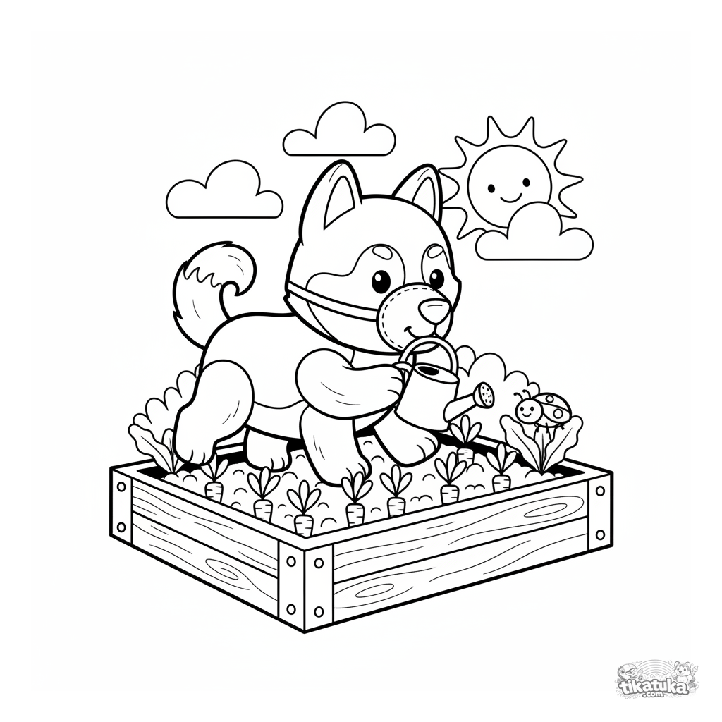 Página para colorir infantil: O filhote de husky Lutik ajuda a regar mudas jovens em uma horta arrumada. Cena fofa de ajuda, formas simples.