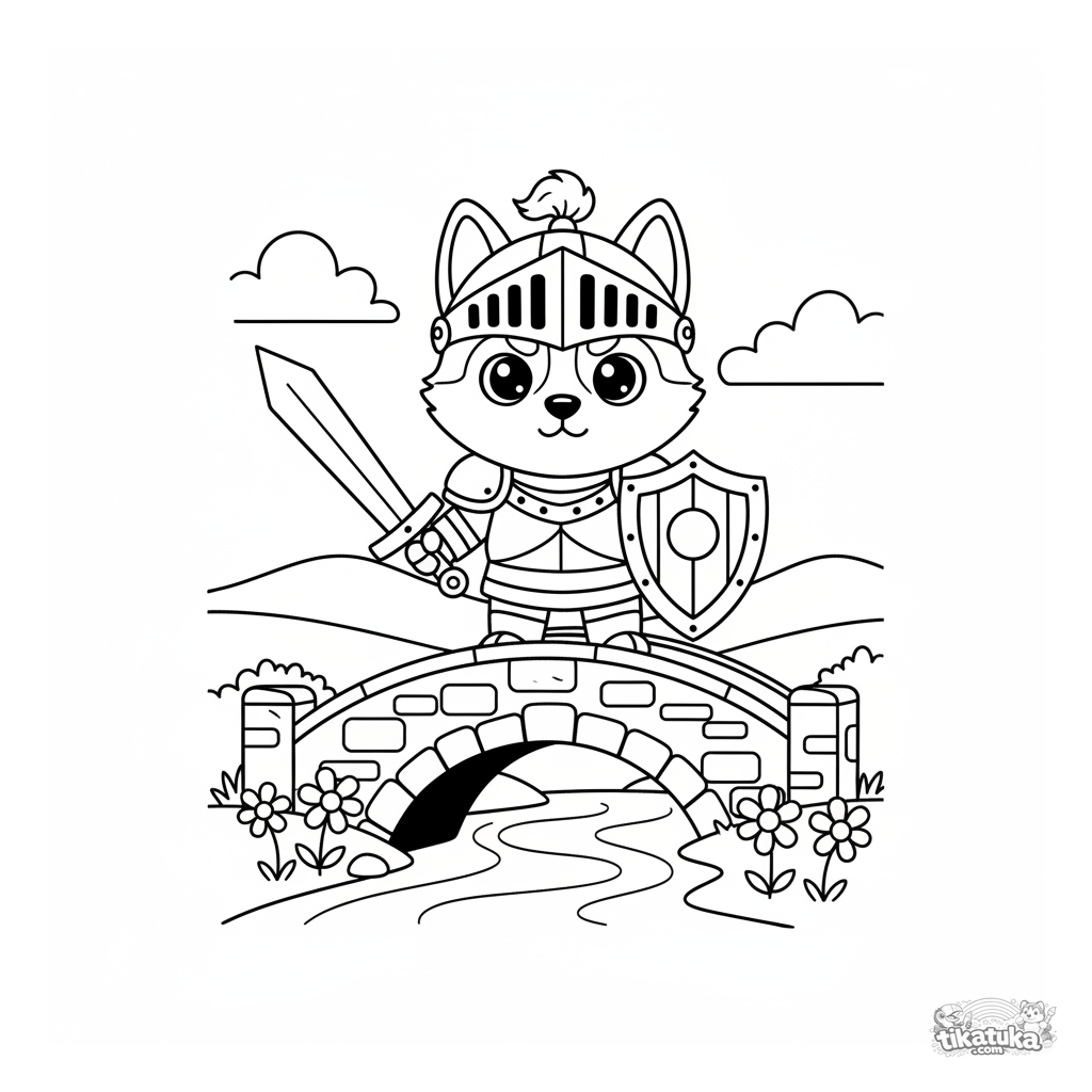 Página para colorir para meninos: um husky cavaleiro em armadura guarda uma ponte de pedra. Pose dinâmica, fundo simples, para 5-9 anos.