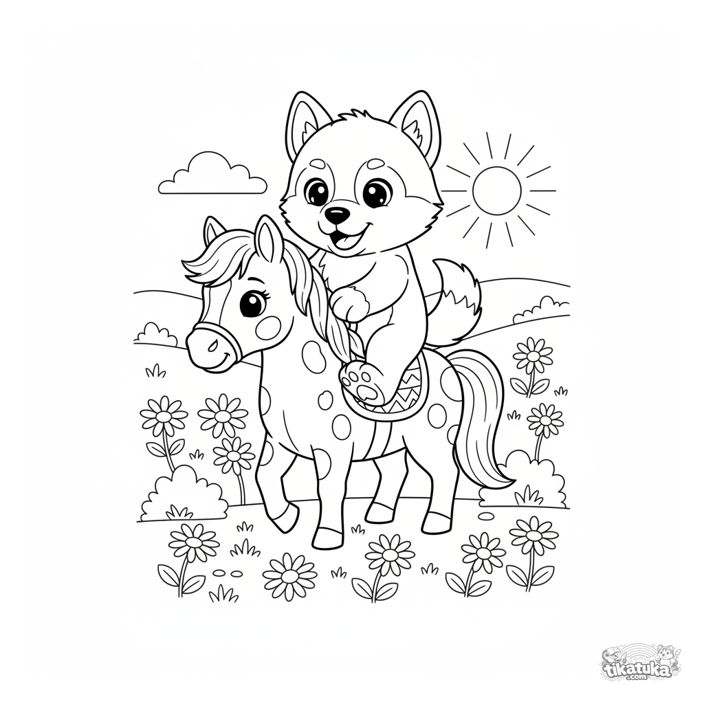 Página para colorir para crianças 4-6: Husky Lutik montando um pônei malhado em um prado cheio de margaridas. Linhas simples, cena fofa para meninas.