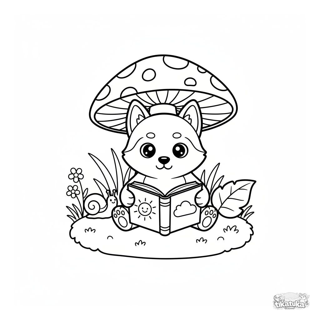 Página para colorir para crianças 4-6: um filhote de husky lê um livro sob um grande cogumelo na floresta. Linhas simples, cena fofa.