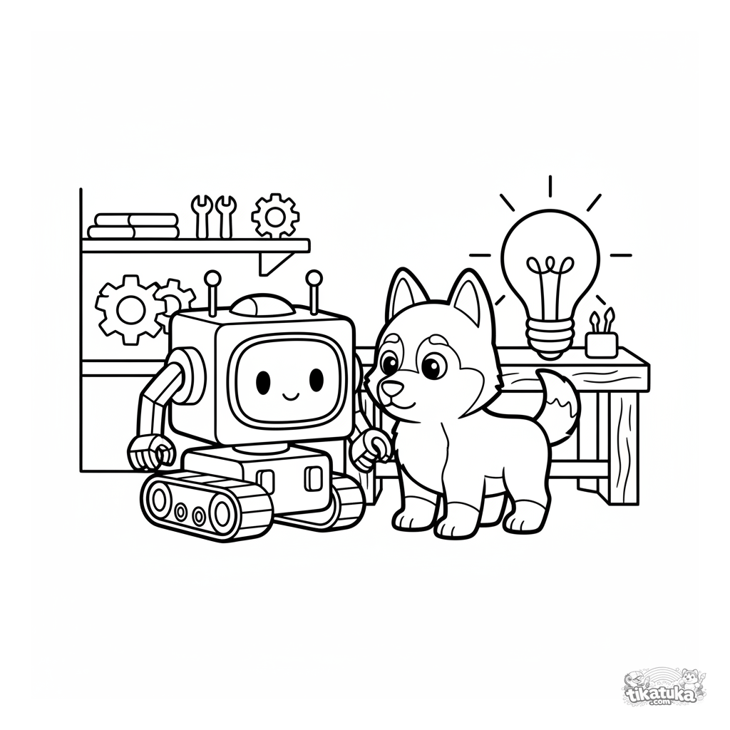 Página para colorir para bebês: Husky Lutik e um robô amigável em uma oficina aconchegante. Formas grandes e simples, poucos detalhes, para 2-3 anos.