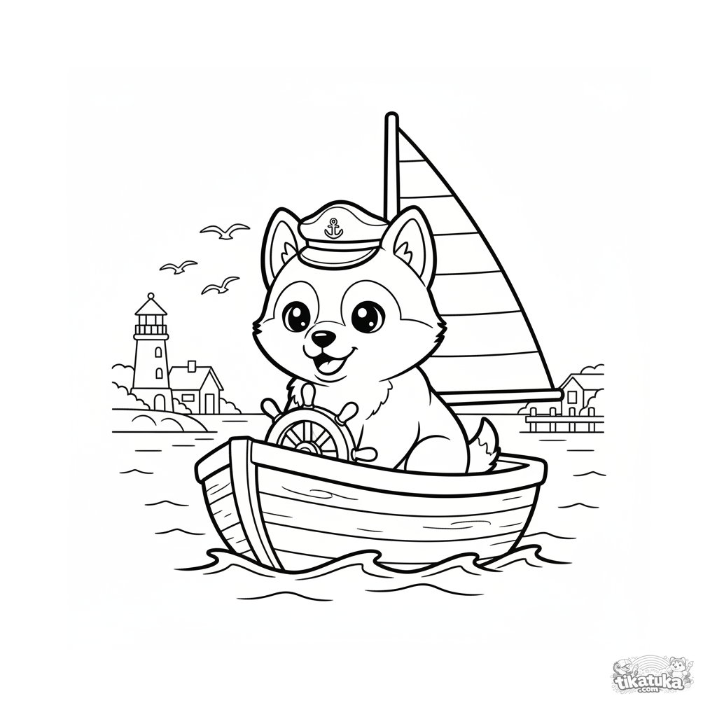 Página para colorir: Husky Lutik com chapéu de marinheiro em um barco a vela de madeira no porto. Cena náutica calma, para 4-6 anos.