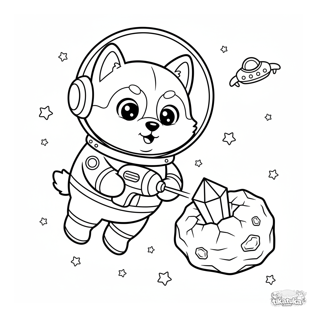 Página para colorir para crianças 4-6: Husky Lutik em um traje espacial minera cristais em um asteroide no espaço. Linhas simples, cena fantástica.