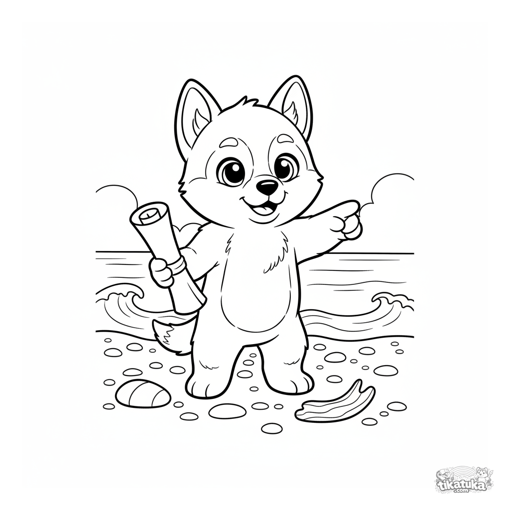 Página para colorir para crianças: um filhote de husky explorador com um mapa do tesouro em uma costa rochosa. Cena emocionante e simples.