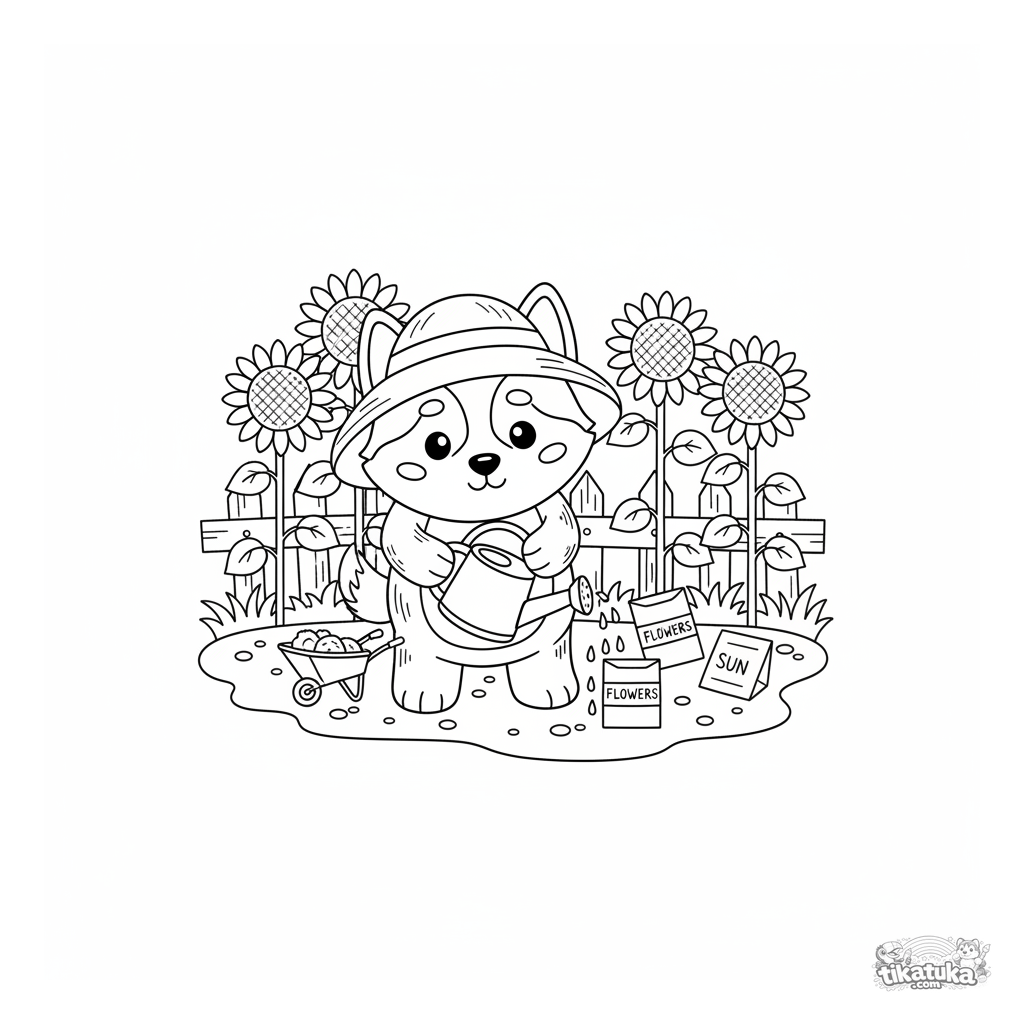 Página para colorir de um jardineiro husky para crianças. Um filhote de peluche com chapéu rega girassóis. Cena de jardim simples.
