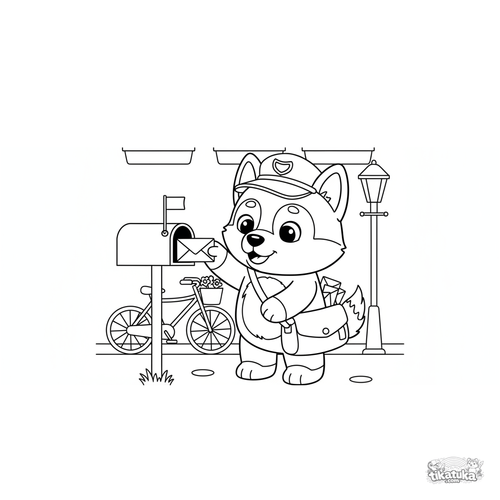 Página para colorir com um carteiro husky. Desenho para crianças de 4-6 anos. Um filhote de pelúcia entregando cartas em uma caixa de correio na rua.