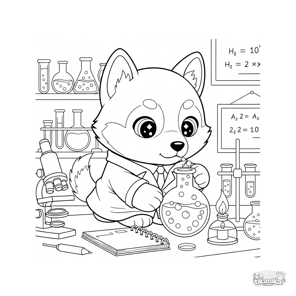 Página para colorir com um cientista husky. Desenho para crianças de 4-6 anos. Um filhote de pelúcia fazendo uma experiência em um laboratório científico.