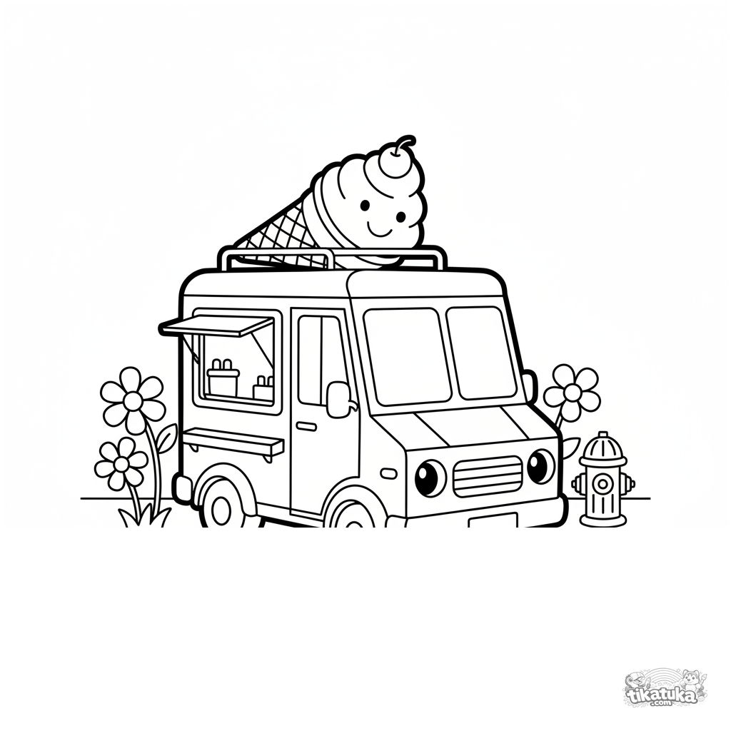 Página simples para colorir de um caminhão de sorvete feliz estacionado numa rua. Para crianças pequenas de 2 a 3 anos.