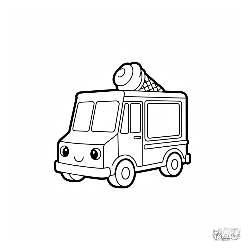 Página para colorir para meninos: um caminhão de sorvete feliz. Para crianças de 4 a 6 anos. Design de veículo simples, margens amplas, expressão amigável.