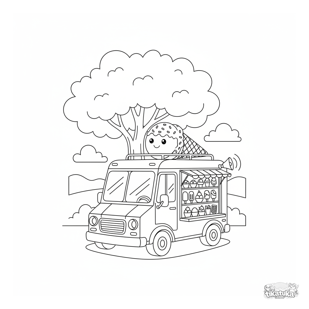 Página para colorir para meninos de 4 a 6 anos. Um caminhão de sorvete alegre com uma casquinha sorridente no teto. Cena de verão e apetitosa.