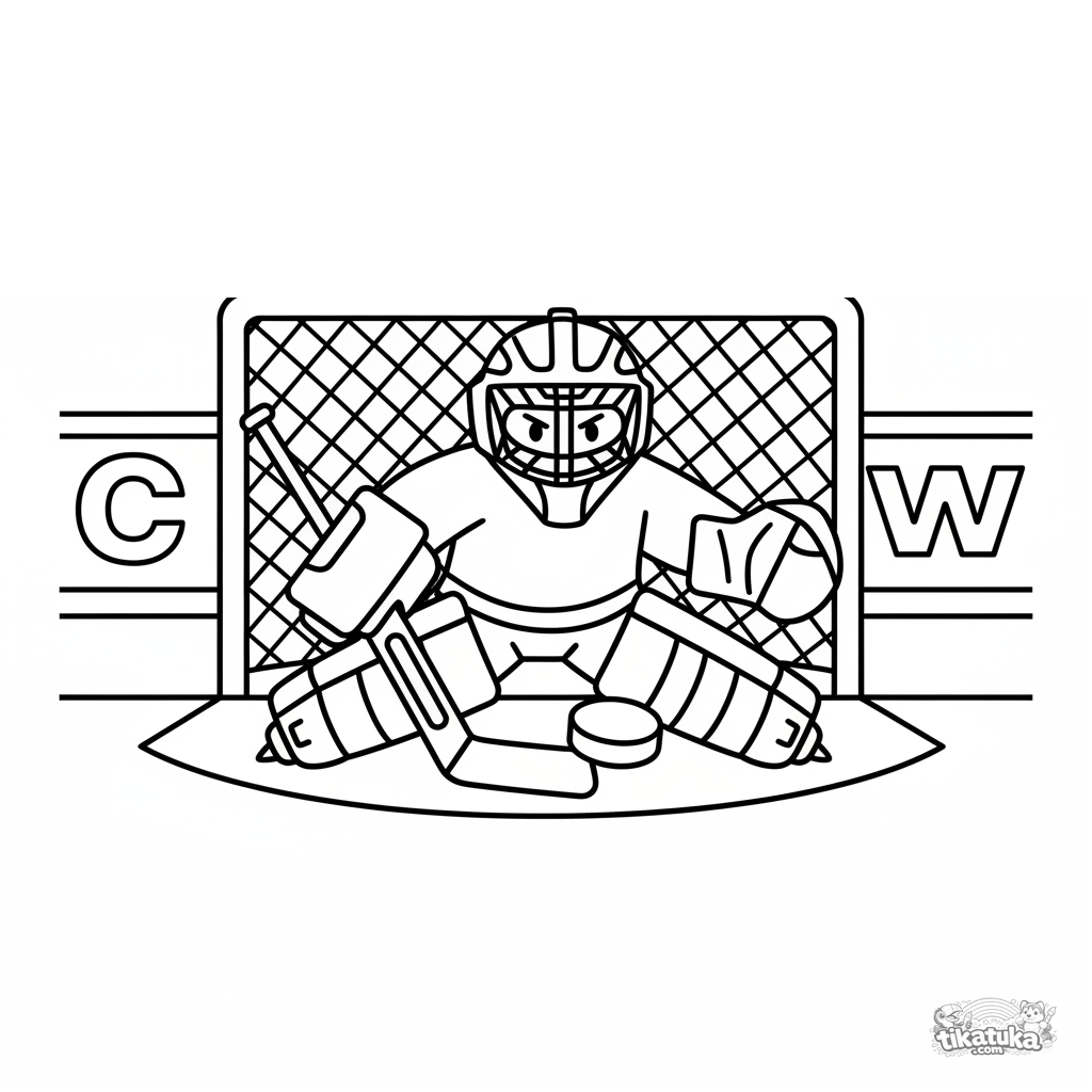 Página para colorir: um goleiro de hóquei com máscara bloqueando um disco no rinque. Para crianças 4-6 anos.