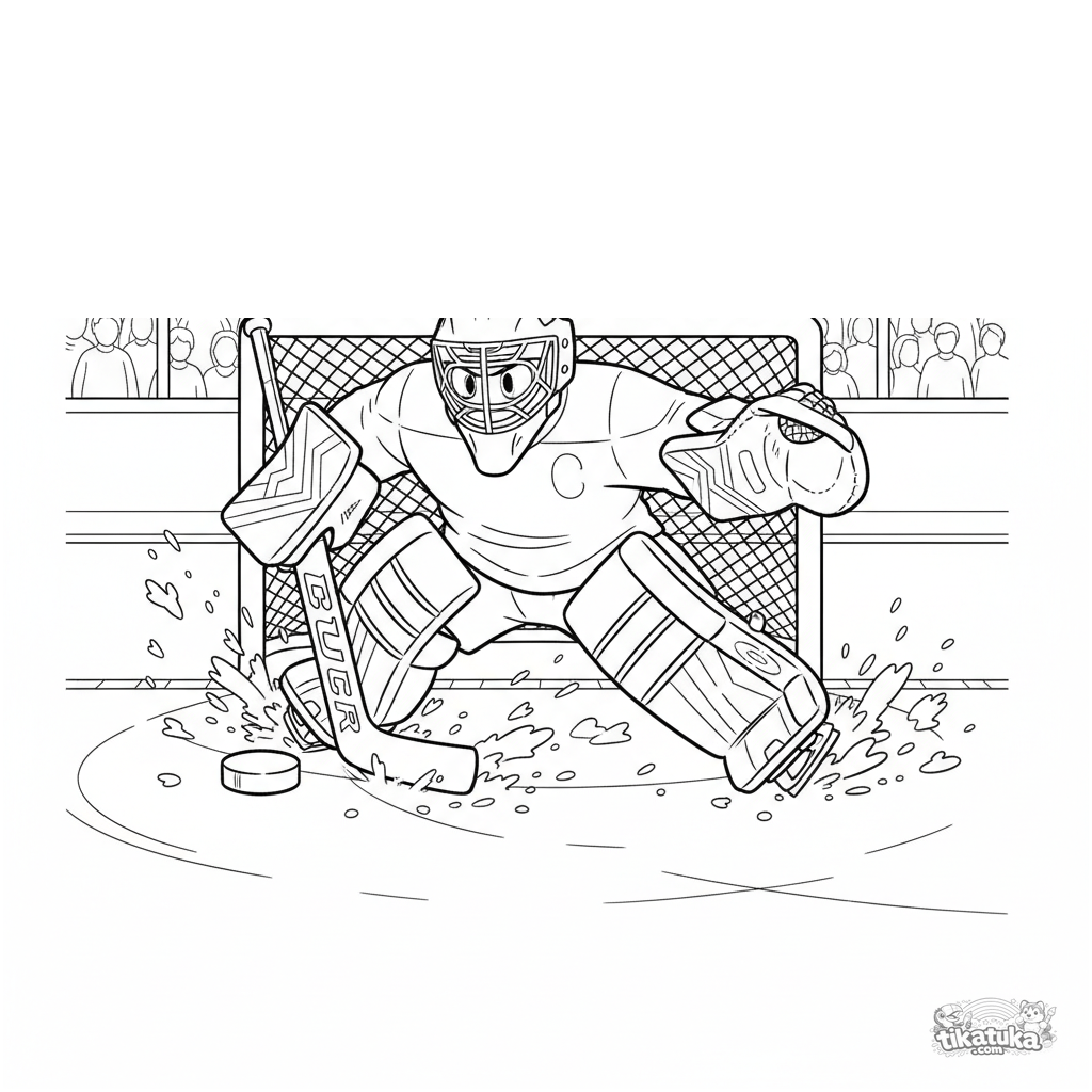 Página para colorir para 7-12 anos: um goleiro de hóquei no gelo faz uma defesa dramática de luva, agarrando o disco. Cena intensa no rinque de gelo.
