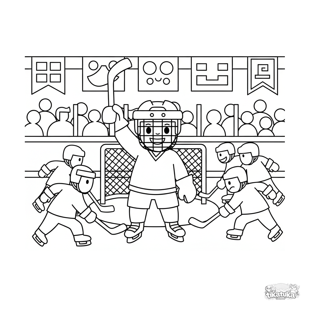Página para colorir infantil: um jogador de hóquei no gelo comemora um gol com alegria. Para crianças de 4-6 anos, cena de ação.