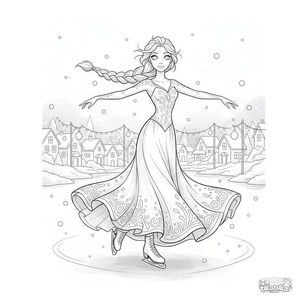 Página para colorir detalhada para crianças de 10-12 anos: uma princesa de gelo em vestido com padrões de geada desliza graciosamente de patins em um lago congelado.