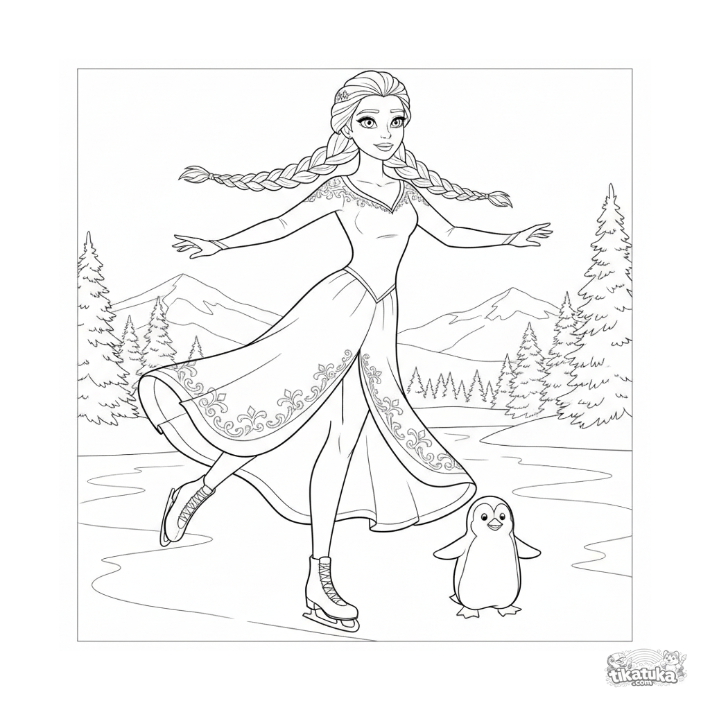 Página para colorir detalhada para 10-12 anos: uma princesa de gelo em um vestido brilhante patina graciosamente em um lago congelado com um pinguim. Cena de inverno intrincada.