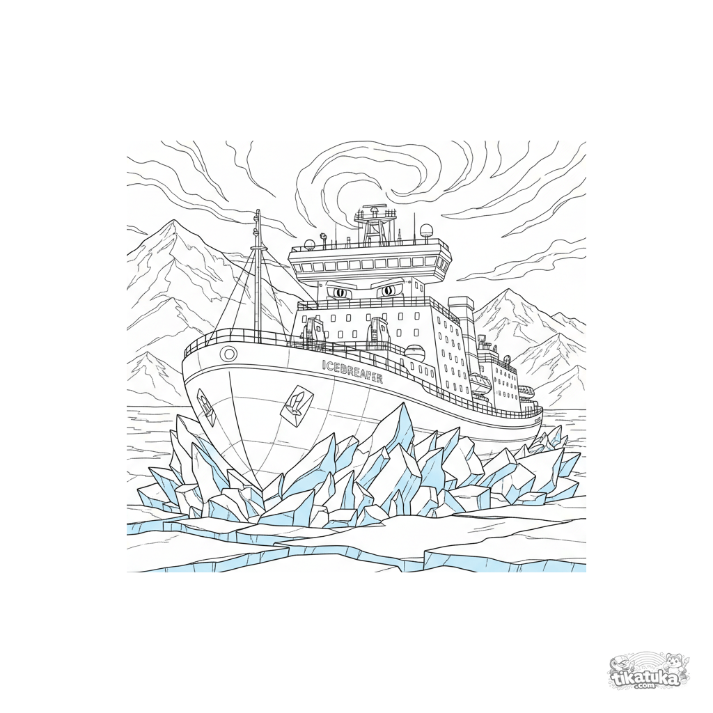 Página para colorir detalhada para crianças mais velhas de 10-12 anos: um poderoso quebra-gelo atravessa o gelo marinho em um fiorde ártico. Detalhes do casco, blocos de gelo e fundo montanhoso.