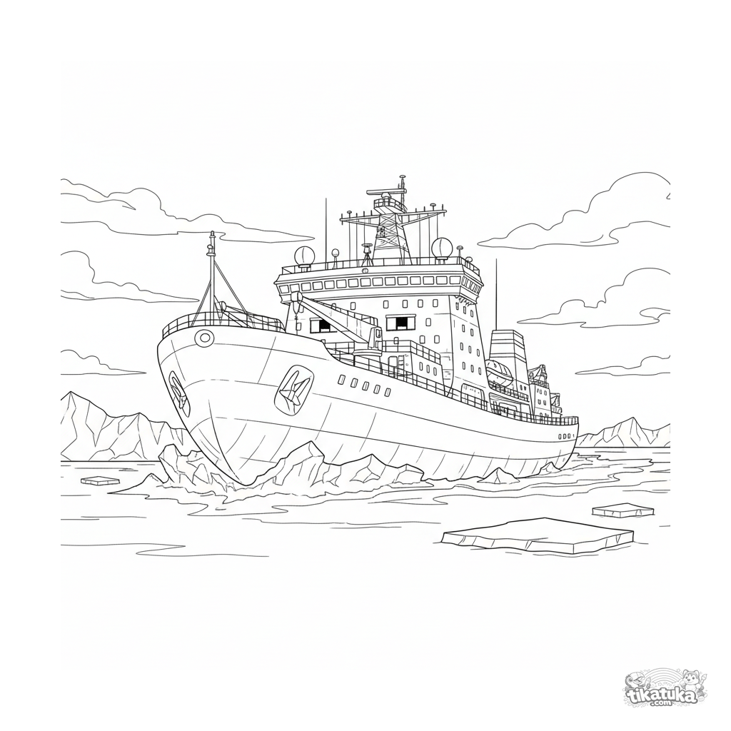 Página para colorir detalhada para crianças mais velhas 10-12: um poderoso quebra-gelo navega pelo gelo ártico. Detalhes do casco, pedaços de gelo e maquinaria oferecem um desafio envolvente para colorir.