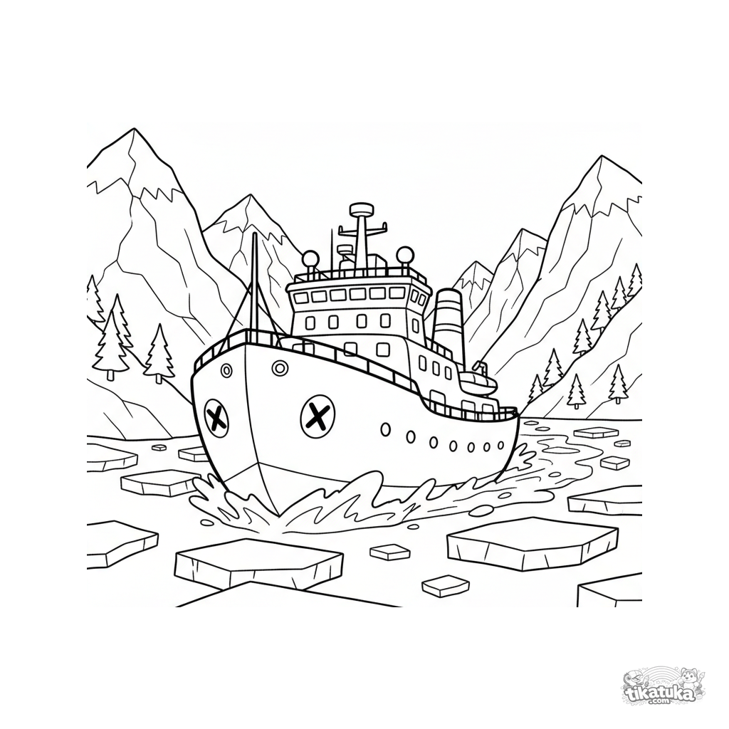 Página para colorir para crianças de 4-6 anos: um poderoso navio quebra-gelo abre caminho no gelo em um fiorde nevado. Estilo construtivista geométrico.