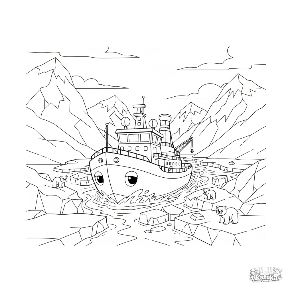 Página para colorir para crianças de 4-6 anos: um poderoso quebra-gelo cortando o gelo em um fiorde nevado. Formas geométricas e cena interessante.