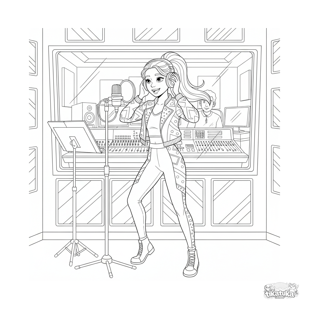 Página realista para colorir anime: uma cantora ídolo ensaia em um estúdio de gravação profissional. Alto detalhe para 10-12 anos: console de mixagem, monitores, fones de ouvido, microfones e partituras.