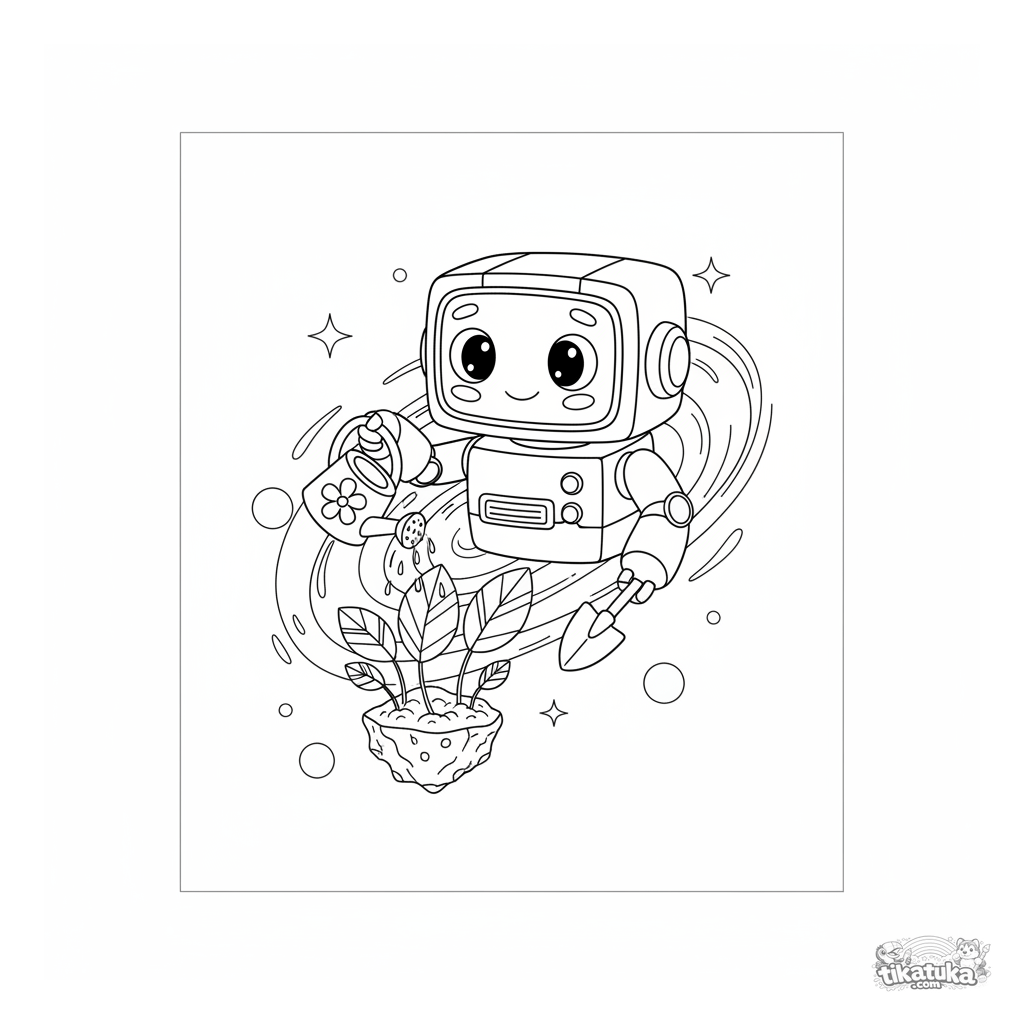 Página para colorir de um robô jardineiro regando plantas de cristal brilhantes no espaço sideral. Para meninos de 4-6 anos, cena de ficção científica.