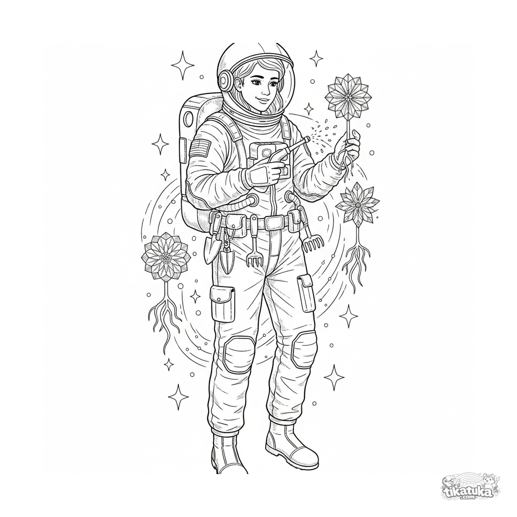 Página para colorir para crianças mais velhas de 10-12 anos: um astronauta jardineiro cuida de plantas cristalinas no espaço sideral.