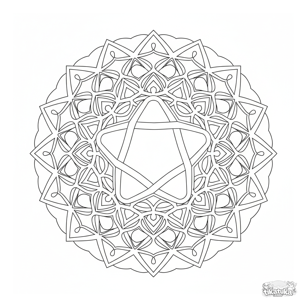 Mandala geométrica intrincada para colorir, para idades 10-12. Estrela central de hexágonos interligados, anéis concêntricos de triângulos e diamantes, simetria perfeita.
