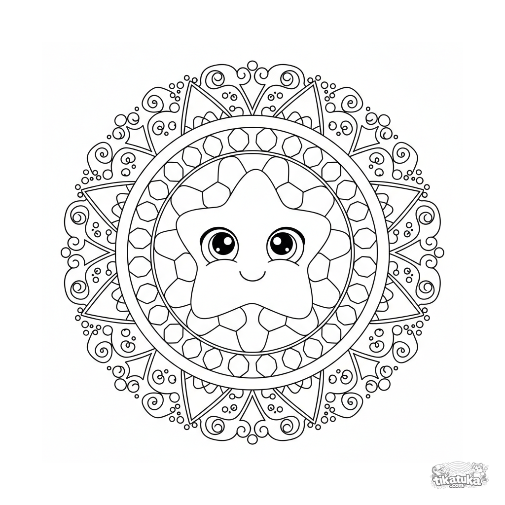 Mandala geométrica intrincada para colorir para 10-12 anos. Estrela central, anéis de hexágonos, diamantes e triângulos. Simetria perfeita, arte linear limpa.