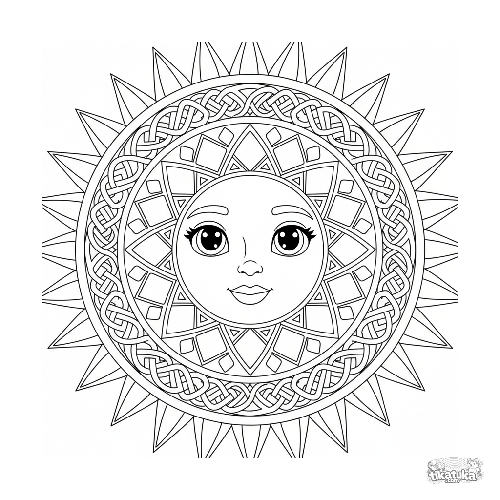 Página para colorir de mandala geométrica intrincada para 10-12 anos. Simetria de oito pontas, padrões entrelaçados, nós celtas e raios de sol, ideal para colorir detalhado.