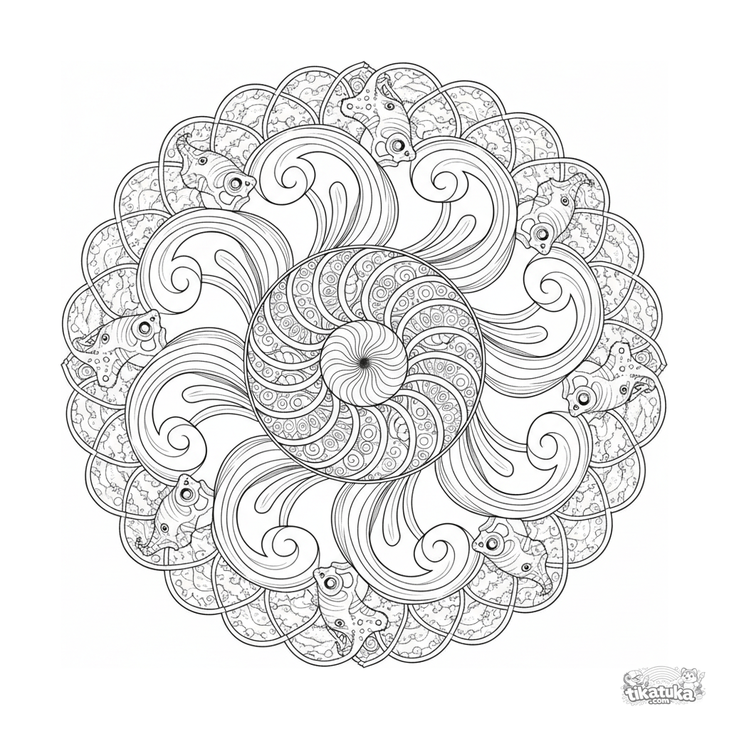 Página para colorir mandala oceânica intrincada para 10-12 anos, com uma concha espiral no centro cercada por anéis de ondas, escamas e criaturas marinhas. Padrão perfeitamente simétrico para colorir com atenção.