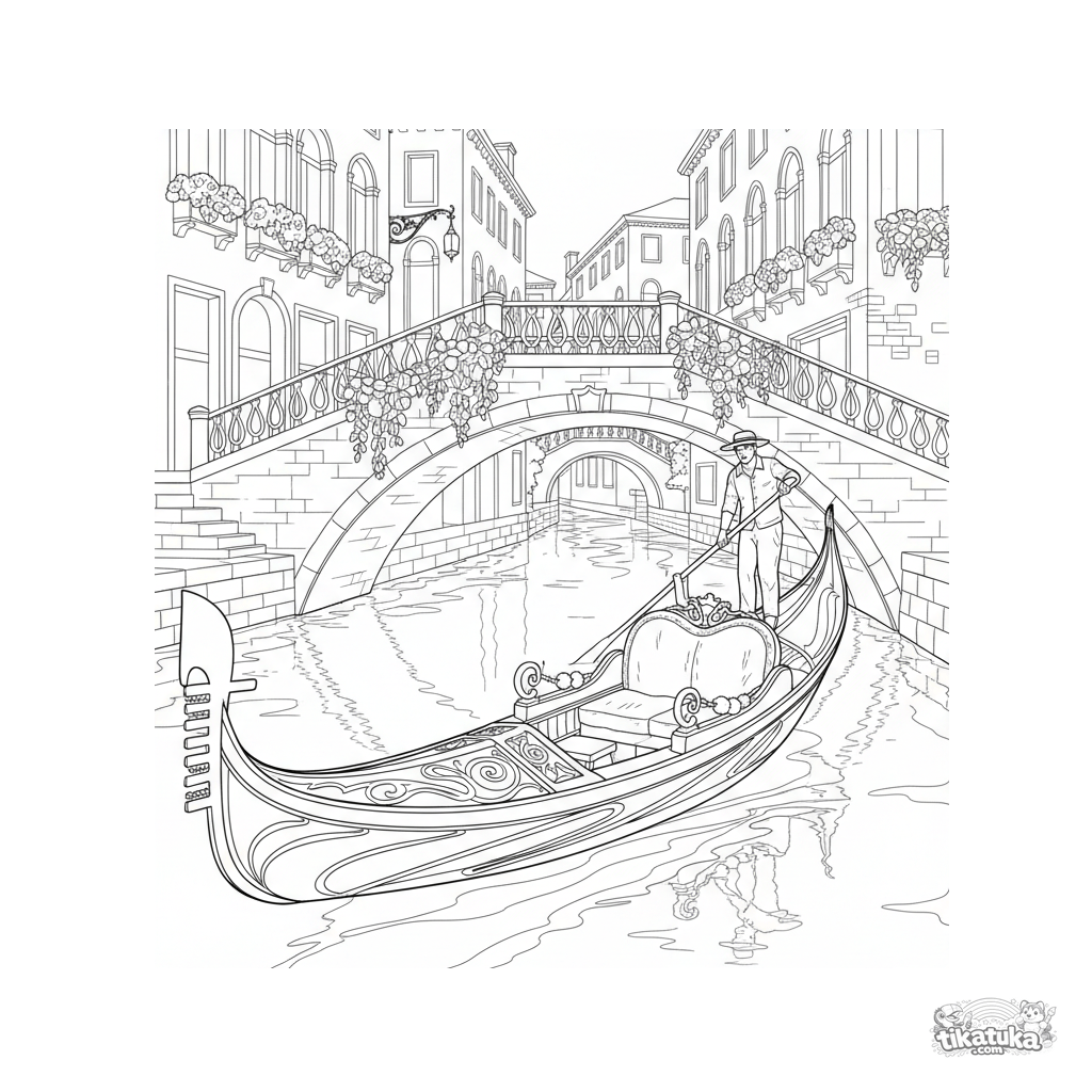Página para colorir detalhada para crianças maiores 10-12: uma gôndola veneziana intrincada desliza sob uma ponte de pedra ornamentada. Muitos detalhes decorativos.