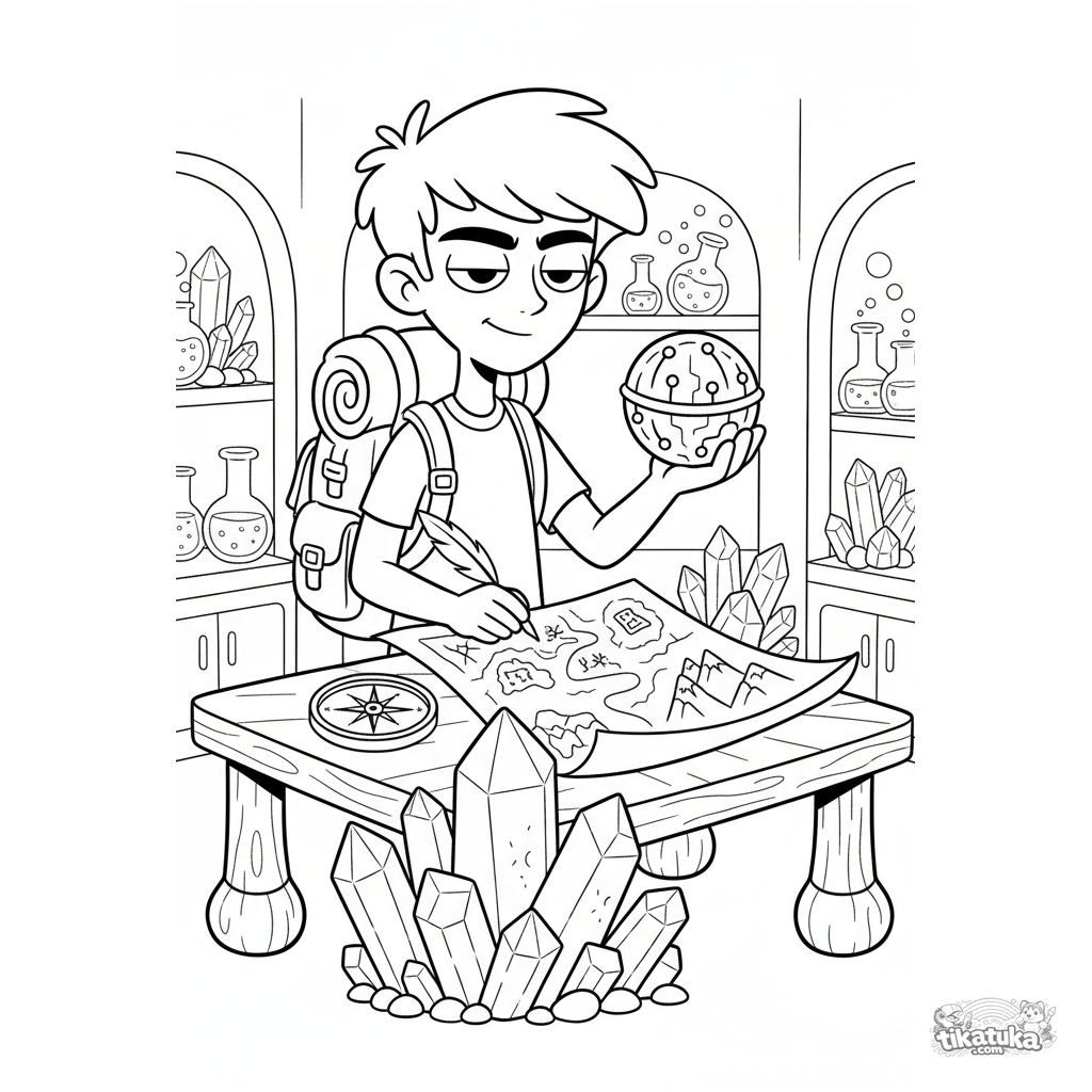 Página para colorir para meninos 7-9: um jovem inventor-explorador em um laboratório secreto mapeia uma misteriosa formação de cristal.