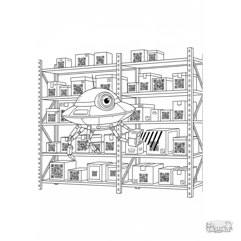 Página para colorir para crianças maiores 10-12 anos: um drone de inventário com feixe de varredura voando entre prateleiras, lendo códigos QR. Estilo técnico de diagrama.