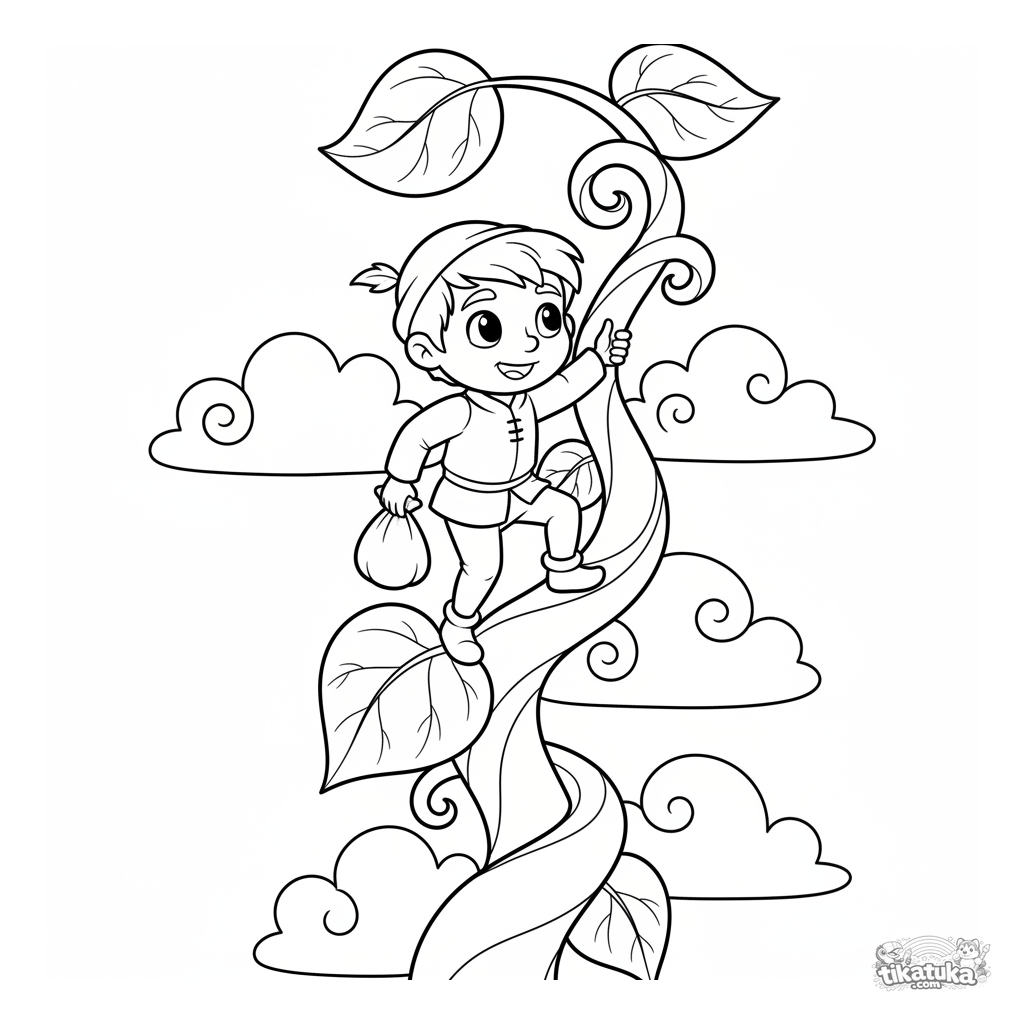 Página para colorir para crianças 4-6 do conto: João escala um pé de feijão gigante para o céu.
