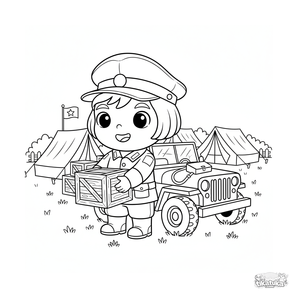Página para colorir para crianças 4-6: um soldado descarregando caixas de um jeep militar perto do quartel-general de campo com barracas.