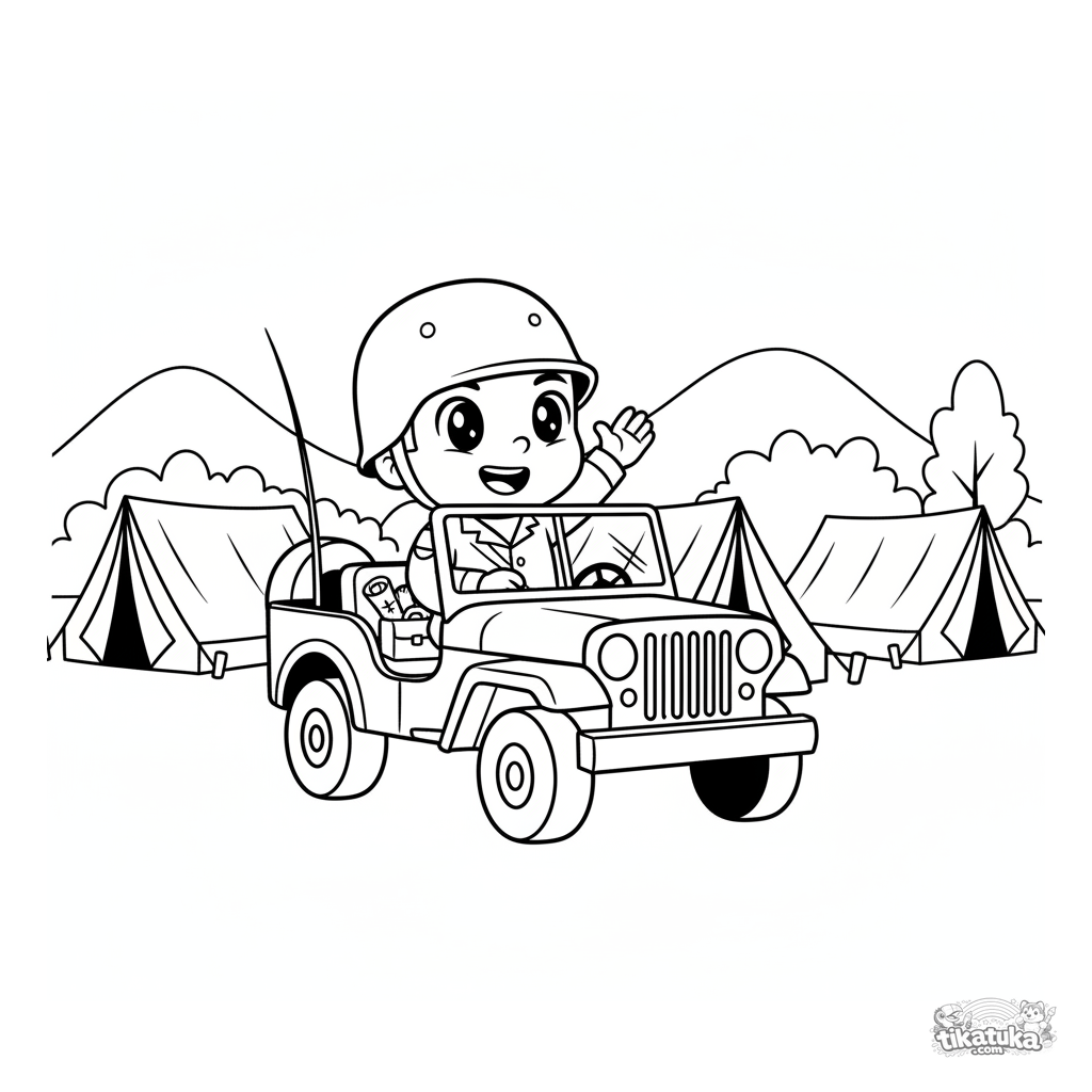 Página para colorir para crianças de 4-6 anos: um soldado alegre dirigindo um jeep do exército perto do quartel-general de campo com barracas. Contornos limpos e formas simples.