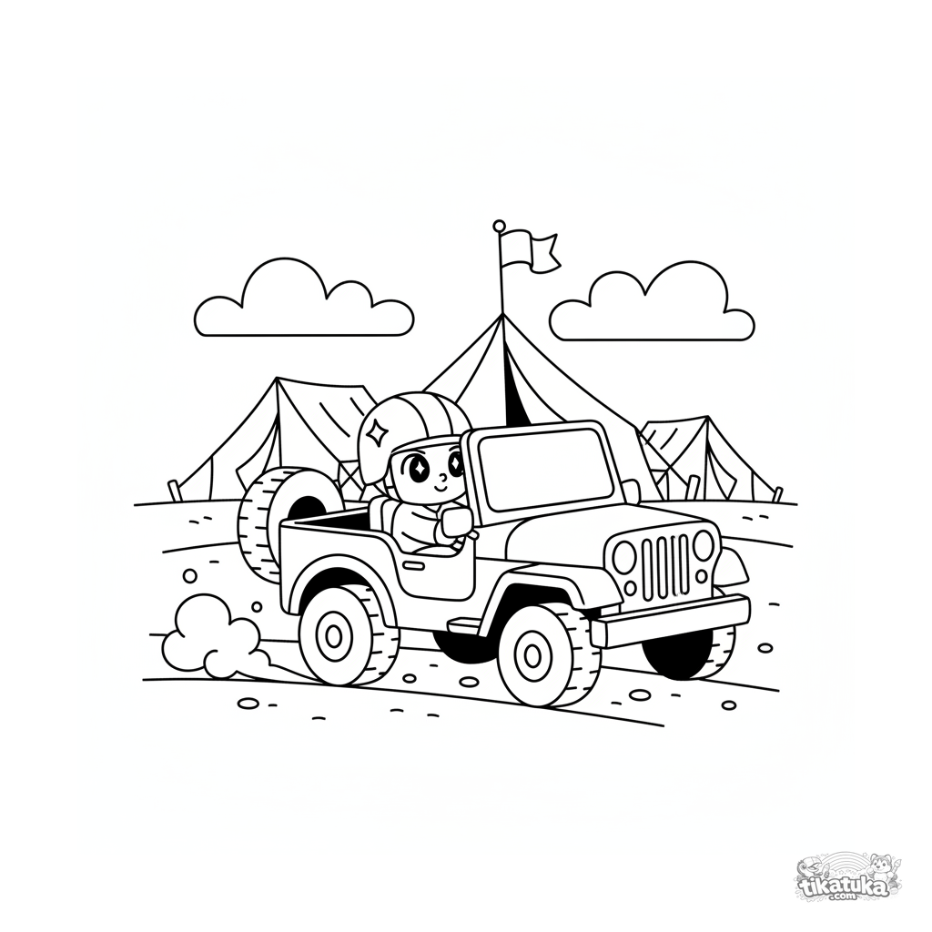 Página para colorir para crianças de 4-6 anos: um jipe militar dirige em uma estrada de terra perto das barracas do Quartel-General. Um motorista alegre ao volante.