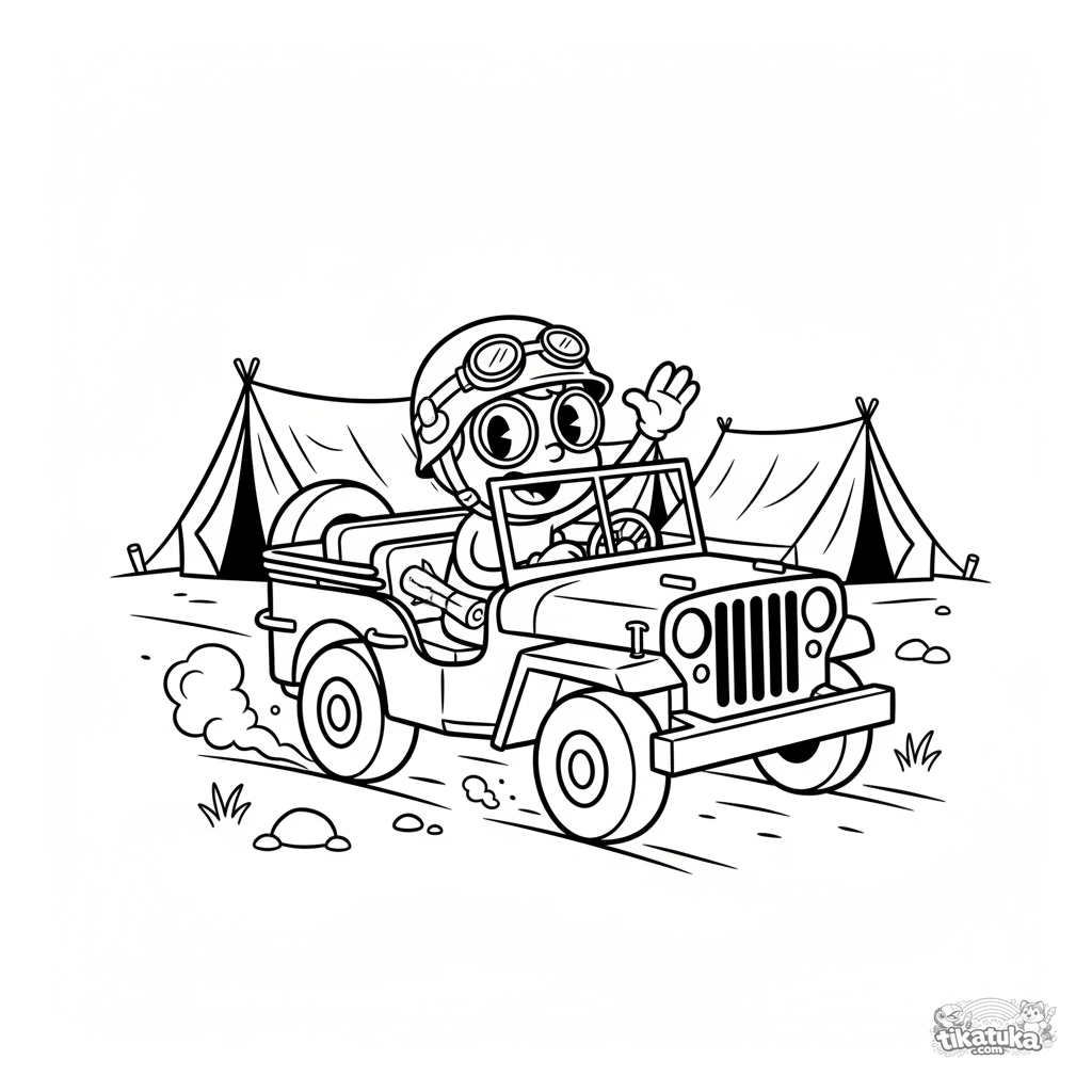 Página para colorir para crianças de 4-6 anos: um Jeep Willys do exército clássico dirige em uma estrada perto de um quartel-general de campo com barracas. O motorista alegre está acenando.